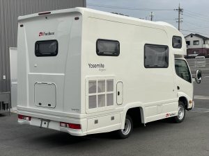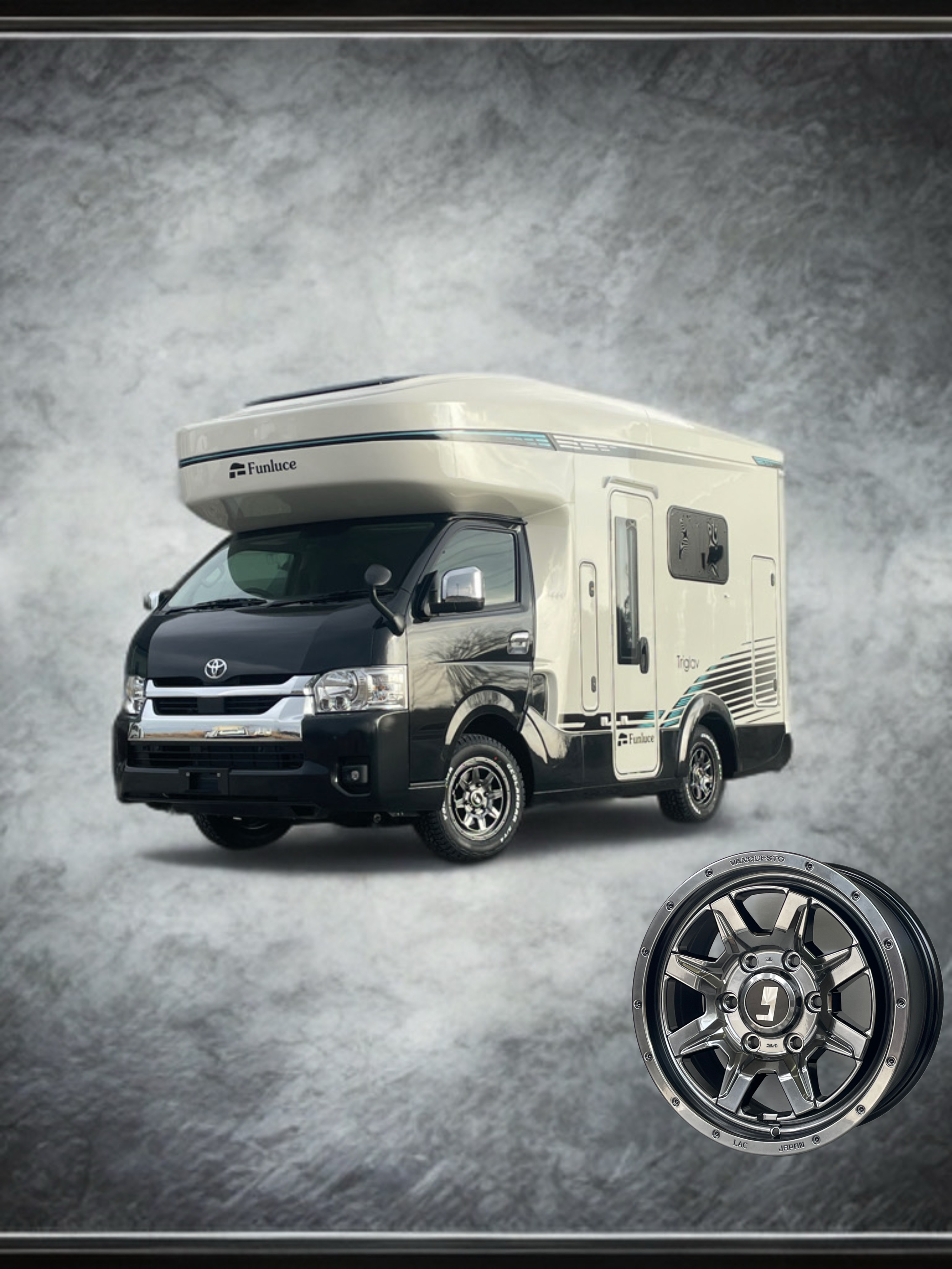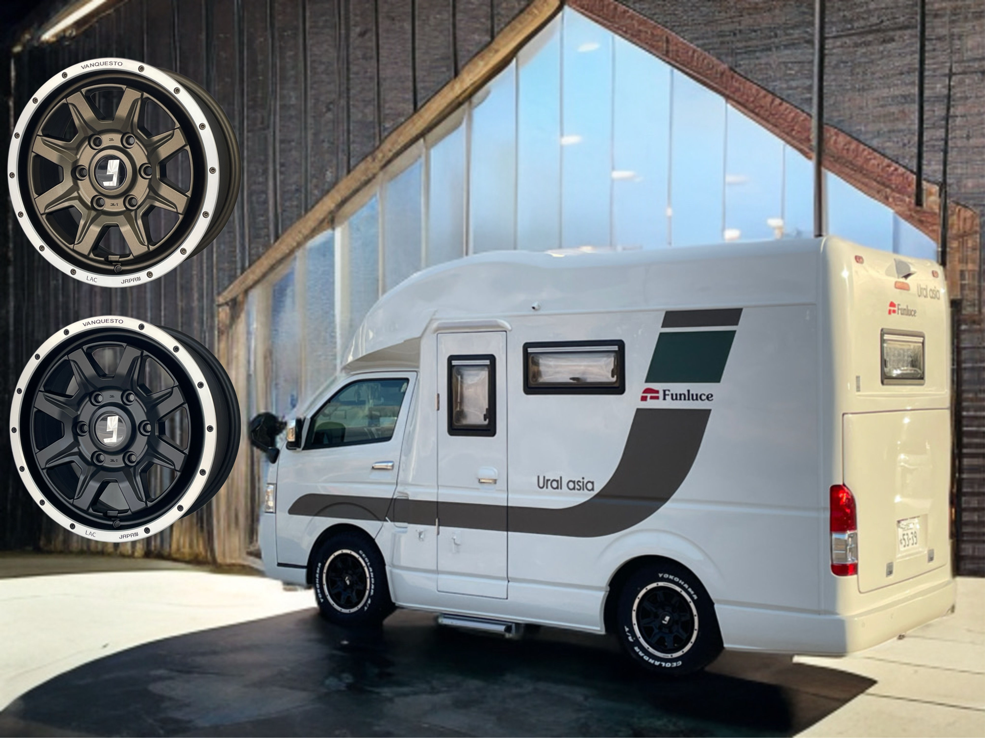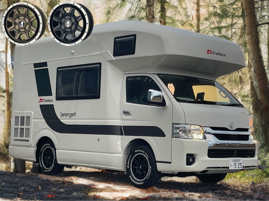 特に、今回は『セレンゲティ525』『ウラル』『トリグラフ』の3台にホイールを装着し、リアには『キャブコン専用スペック』として通常より30mmアウトセットしたオフセット+8というサイズのホイールを装着しております。キャブコン特有のふらつきを抑制するとともに、何より、見た目の良さにつながったかと思います。ぜひ、会場でご覧になってください。