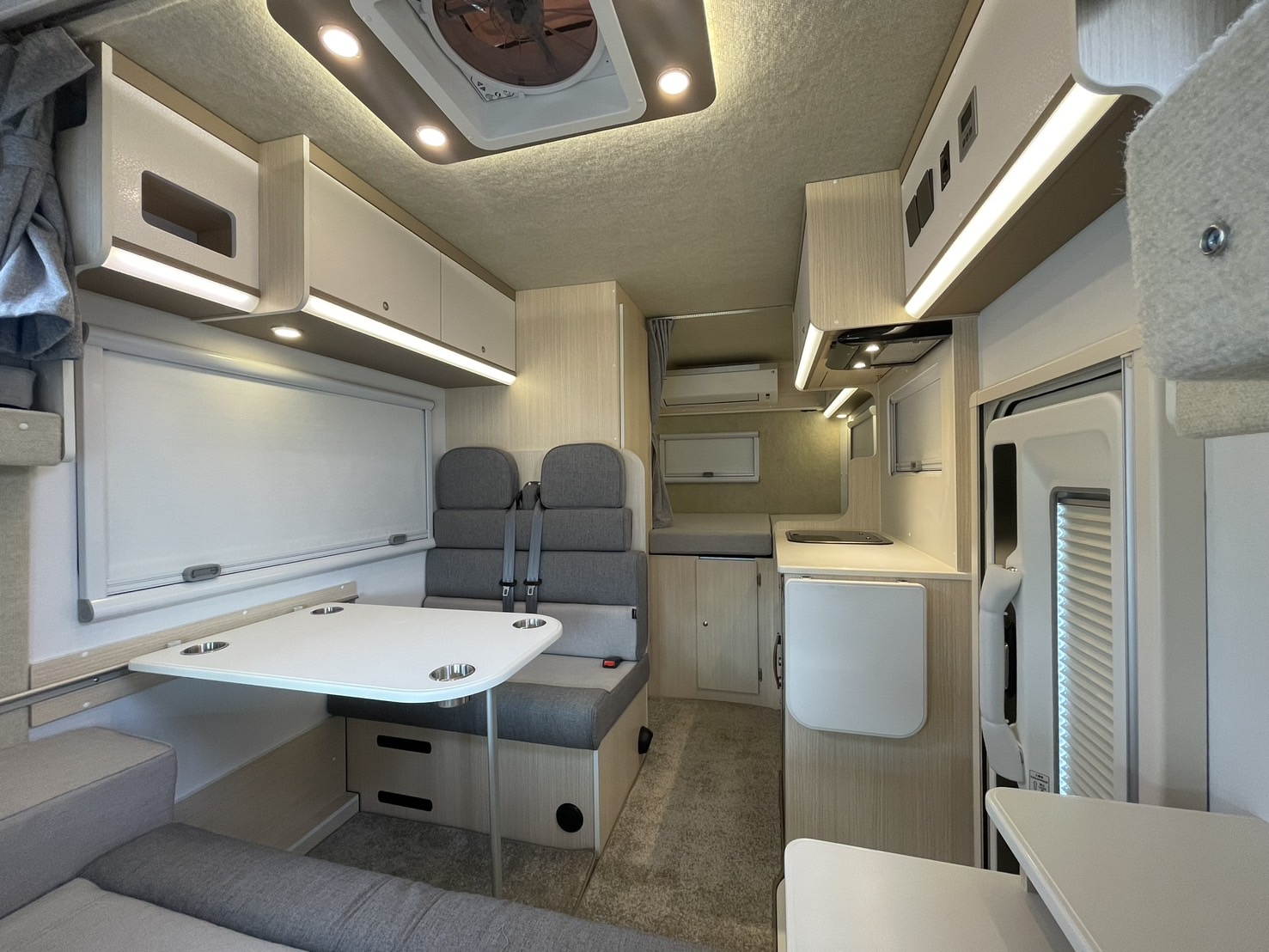 全長5M以内のキャブコン+2段ベッドレイアウトでは他社さんも製作してはおりますが、そこをあえて5.3Mキャブコン+常設ベッドレイアウトにて製造しております。