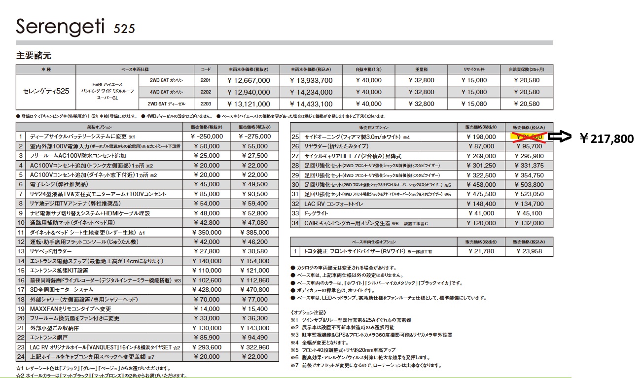 セレンゲティ525のオプションのサイドオーニングの税込み価格に間違いがございました。